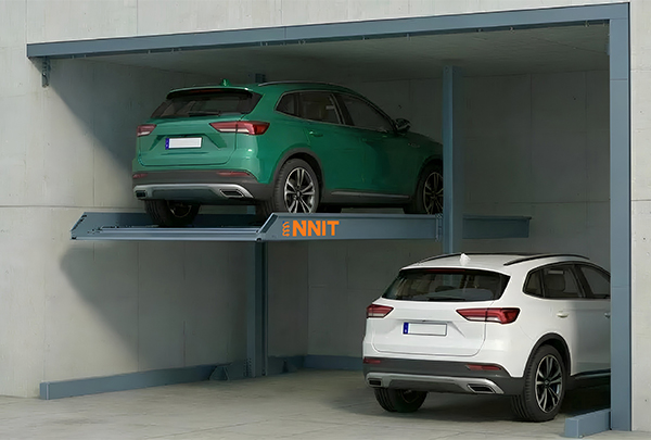 2DP 101 uses a platform that is driven upwards and downwards. A car is parked on the platform when it is at the ground level. When driven upwards to its peak level, another car can be parked below the platform.