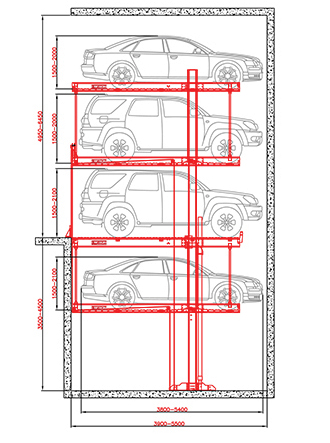 4DP uses 4 platforms driven upwards and downwards in a group of 2 platforms each. 1st and 2nd level platforms make a group and similarly, 3rd and 4th level platforms also make a group. Car parked on 2nd level platform has to be driven out and parked elsewhere while taking out car parked on 4th level platform. 1st, 2nd and 3rd level cars can be driven out independently.